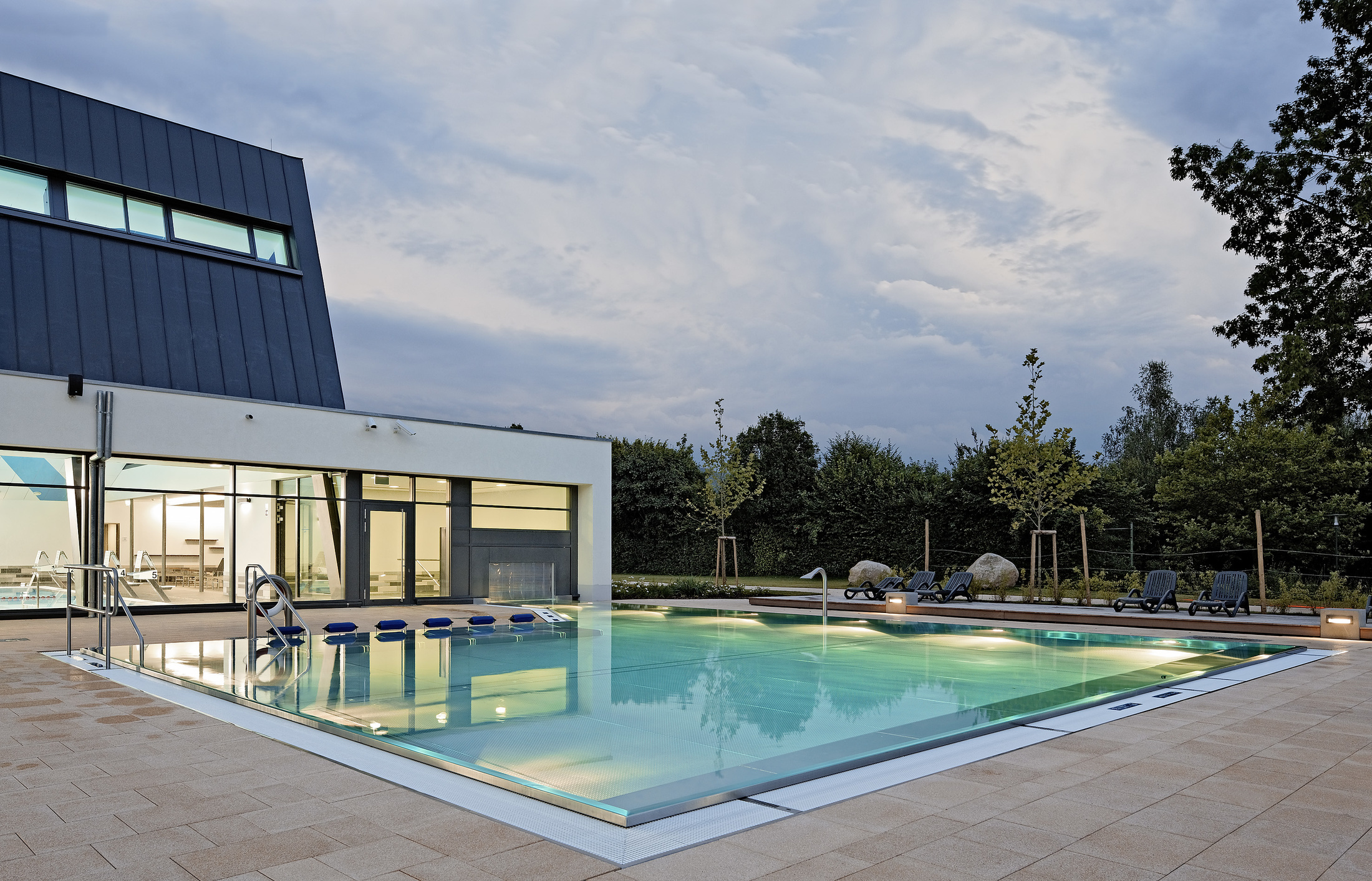 Genießen Sie das  warme Wasser unter freiem Himmel und entspannen Sie auf´s "Wohligste". Im Innenbereich finden Sie einen schönen, eigenen Aufenthaltsbereich: Dies ist Urlaub im Alltag. Von dort schwimmen Sie hinaus in das Außenbecken, um das angenehm warme Wasser des Vier-Jahreszeiten-Beckens zu genießen.
