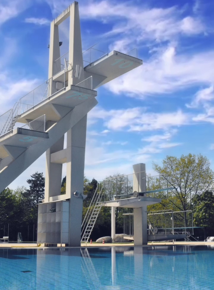 Ob 1 Meter, 3 Meter, 5 Meter, 7,50 Meter oder 10 Meter, hier kann jeder seinen Mut und seine Fähigkeiten auf dem Sprungturm testen. Ein Genuss ist die herrliche  Aussicht mit einem wunderbaren Blick in die "Breisgauerbucht". Tauchen Sie ein in das 5 Meter tiefe "Blau" und erleben Sie die bewundernden Blicke der Zuschauer :-)